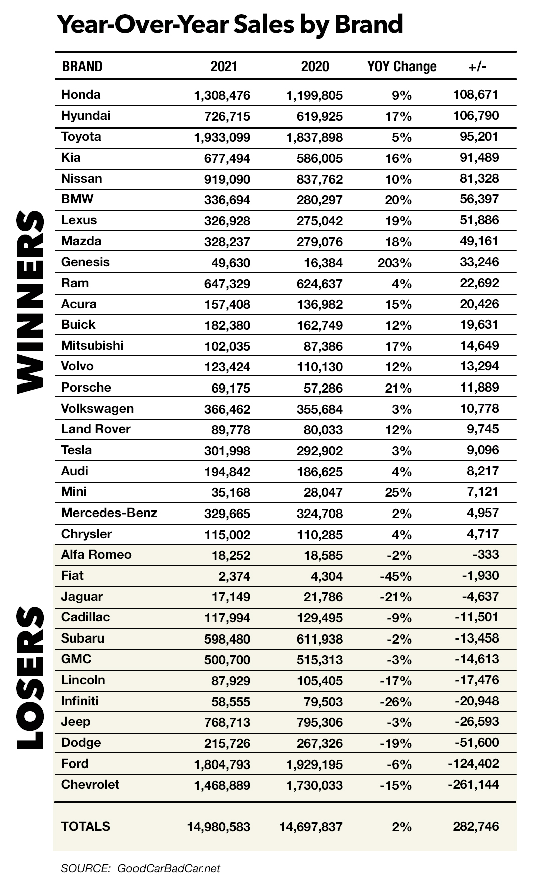 It’s been an eventful year in the auto industry. The chip shortage has been a blessing for some and a catastrophe for others. While U.S. automakers continued with their “on-demand” approach to acquiring parts, many global automakers were fully stocked and ready to build as COVID gave way and production lines started rolling again. That philosophy caused Chevrolet, Ford, Jeep, Cadillac, Dodge and others to experience a sales drop in 2021 from 2020. But congratulations to Honda, Toyota and Hyundai — along with Kia, Nissan, BMW, Lexus, Porsche, Mini, Land Rover and a few others — they experienced significant gains in 2021 over 2020.